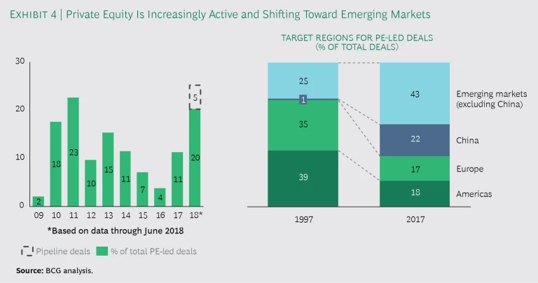However, strong growth in emerging markets, an improved regulatory environment, and a stable growth outlook are turning the tide. (See Exhibit 4.) PE players usually hunt for independent assets that are easier to value, manage, and, ultimately, sell. And because PE firms’ participation generally raises few if any regulatory or antitrust concerns, they often enjoy a built-in advantage over strategic buyers.