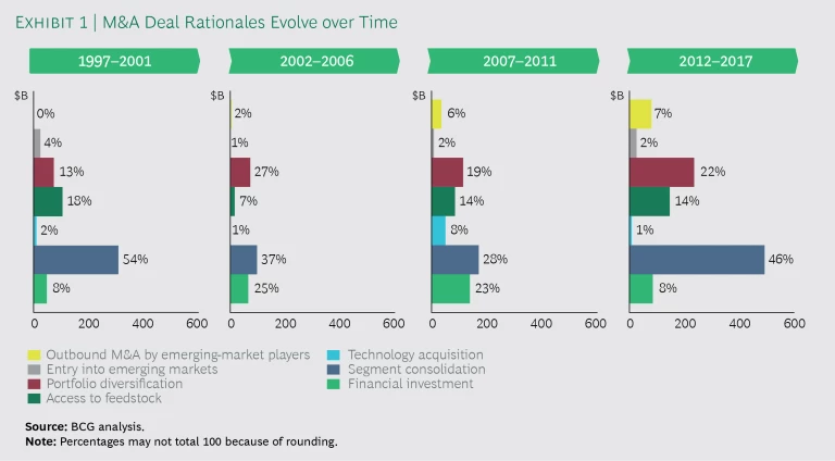 The reasons for consolidation vary. Some companies, such as those in the agrochemical segment, are motivated to consolidate to gain scale and lower costs, which they can accomplish by acquiring related businesses and combining R&D, production, sales, and logistics activities. Others seek to strengthen a specialty, snapping up divisions or assets rather than entire companies. This rationale is particularly dominant among base-chemical players that want to go downstream into high-value and niche businesses such as compounding.