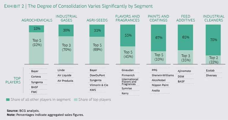 But the degree of consolidation in the different specialty segments varies greatly, and that creates some interesting dynamics and opportunities. In specialty segments where there are still many players—such as industrial cleaners and feed and food additives—we expect the volume of deals to remain strong. In segments that have already undergone significant consolidation—such as industrial gases, paints and coatings, agrochemicals, and flavors and fragrances—we expect fewer but higher-value deals for the simple reason that there are fewer but larger targets. (See Exhibit 2.)