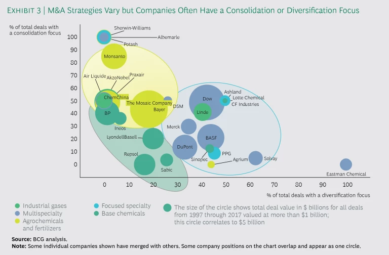 Over the years, players such as Dow Chemical, DuPont, BASF, DSM, and Solvay have pursued M&A deals to diversify their end industry exposure. But companies must carefully balance their diversification and consolidation goals. (See Exhibit 3.) However, by no means do portfolio diversification and market consolidation contradict each other. Portfolio diversification is intended to expand a company’s exposure to new end industries or new customers whereas segment consolidation is deployed to increase market share within the select few segments in which the player sees the highest value.