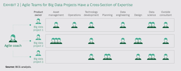 The European oil refinery mentioned above took such an approach when it incorporated agile ways of working into three big data projects launched as part of a larger digital transformation initiative. Each project had a dedicated scrum team with a scrum master, product owner, and personnel from such key functions as operations, technology development, asset maintenance, and IT. Data scientists from an outside advanced-analytics consulting firm were included on the teams. The teams and agile approach helped the refinery produce multiple MVPs within a four-month span and industrialize a final product considerably faster than it could have done in the company’s typical product development cycle. Multidisciplinary scrum teams also contributed to a more collaborative corporate culture and drastically increased employee engagement.