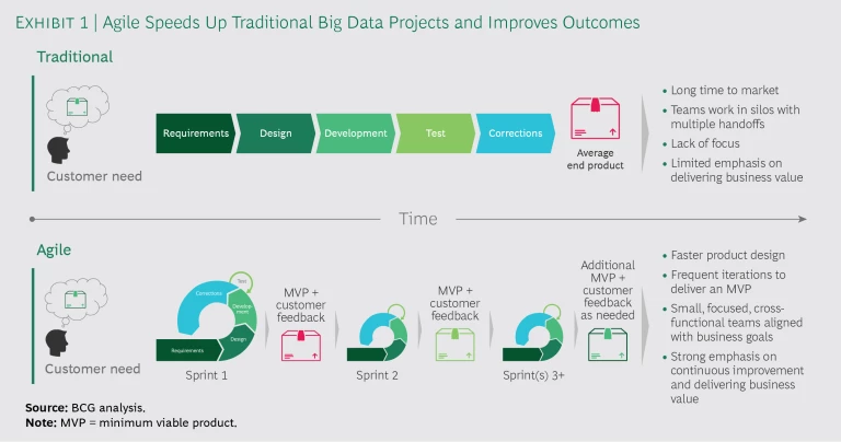 Agile has shown great promise in many fields besides software, including financial services, marketing, and consumer goods. (See “Agile to the Rescue in Retail,” BCG article, October 2018, and “Taking Agile Transformations Beyond the Tipping Point,” BCG article, August 2018.) In client engagements, we have seen agile empower teams to do their best work while assuring that they are aligned with an organization’s strategic goals. Given those successes, we believe that agile could bring several specific benefits to big data projects.