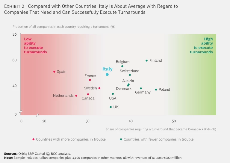 We also compared Italy with other countries in terms of both the need for companies to execute turnarounds (the share of companies that are experiencing a crisis in profitability) and their ability to execute turnarounds (the share of successful turnarounds compared with the overall number of troubled companies).
