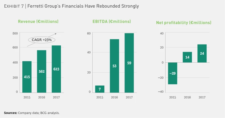 The turning point of Ferretti’s turbulent voyage came at the end of 2014, when the company brought in a new CEO to lead what would become its comeback. The CEO appointed new executives in all key positions. The influx of talent brought additional capabilities and managerial know-how from such sectors as automotive and aeronautics, and the company launched several turnaround measures.