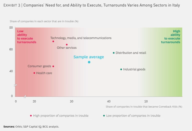 We conducted a similar benchmarking analysis to look at the turnaround performance of Italian companies by industry. (See Exhibit 3.) Companies in the industrial goods and distribution and retail industries were both more likely, on average, to be successful; those in health care and consumer goods were less likely to succeed. Most notably, the technology, media, and telecommunications (TMT) industry had the highest share of companies in trouble, and they were among those with the lowest ability to turn themselves around. This can be explained by the way that digital is constantly disrupting TMT segments, particularly established incumbent companies in telecom and media, which have deeply entrenched cultures.