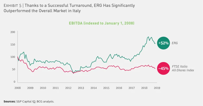 In hindsight, there were several factors behind the company’s success. First, management had the foresight to take bold action early on: even though oil assets had accounted for most of the company’s revenue throughout its history, ERG shed them when the extent of the crisis was still unclear, ensuring a prompt repositioning for the long term. Second, the company adequately funded the turnaround, using the disposal plan to guarantee cash for its growth in the new core sector. Finally, ERG put the right organizational measures in place to sustain performance throughout the turnaround and over the long term.