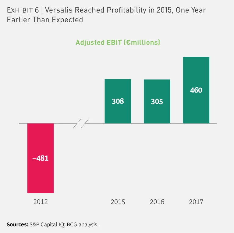 The original goal of the transformation was for the company to return to profitability by 2016. Versalis beat that goal by one year, posting more than €300 million in adjusted EBIT in 2015. (See Exhibit 6.)