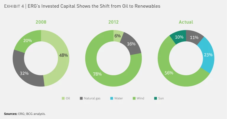 To capitalize on this shift, ERG launched a turnaround program to scale back its oil operations and reorient the portfolio around renewables. The company began a series of oil-linked disposals in 2008, totaling about €3.6 billion in deals by 2018, when the company was entirely out of the refining and service-station businesses. Over the same period, the company invested €4.3 billion in renewable assets in areas including wind, solar, and hydroelectric power generation.