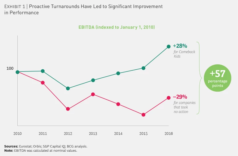 Notably, this group only represented one-third of all companies that experienced problems. But the improvement in financial performance for these Comeback Kids, as we call them, was striking: The full group of 32 generated an increase of 28% in EBITDA from 2010 to 2016, compared with just 6% for the full sample of 200 companies and –29% for struggling companies that were unable to execute a successful turnaround. (See Exhibit 1.) The average annual total shareholder return—a metric that includes both capital gains and dividends—for the Comeback Kids was 7% during our time frame, compared with –3% for the companies that missed their turnaround window.