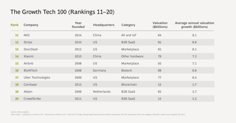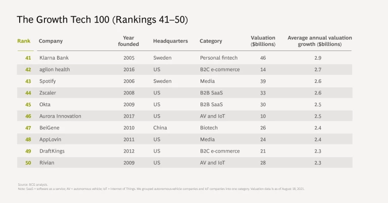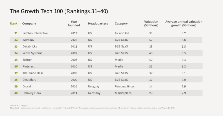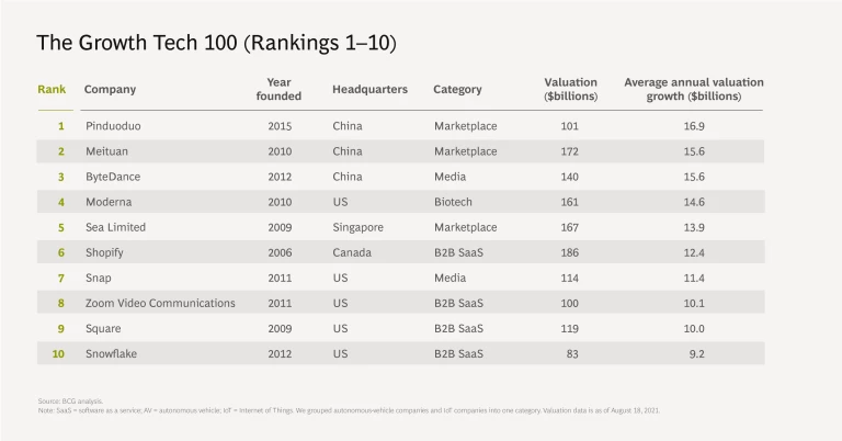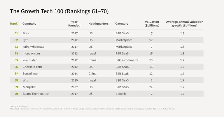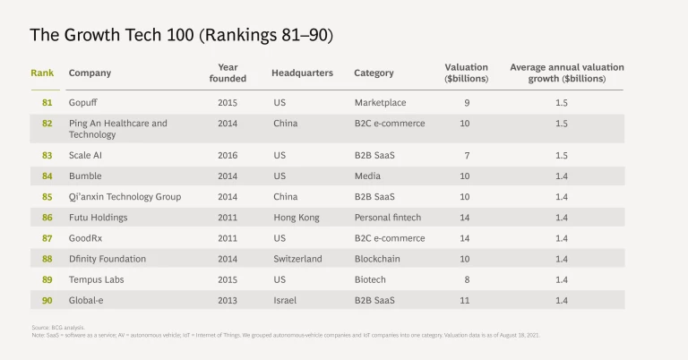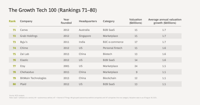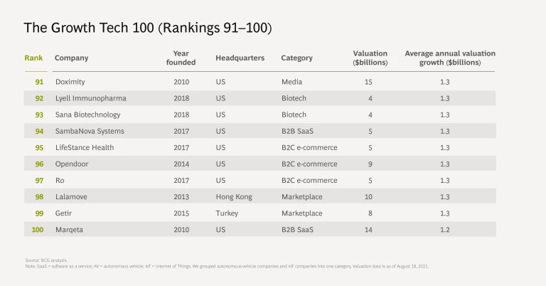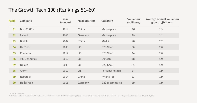 We then sorted the list by average annual valuation growth to identify the top 100 companies globally. (We used valuation data as of August 18, 2021.) Finally, we excluded companies with a current valuation of less than $1 billion (including subsidiaries and spinoffs) to arrive at the final list.