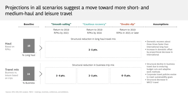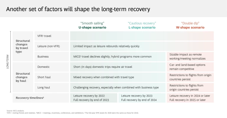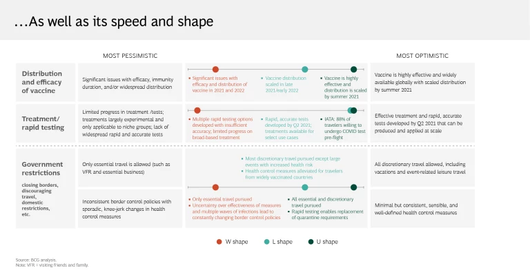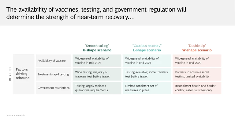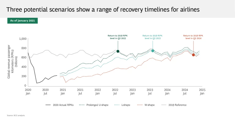 Based on the best modeling of our health care experts, our ongoing research among consumers and businesses about their travel plans, and our work with governments worldwide, we have analyzed several potential scenarios for the future and their short- and longer-term implications for airlines. This planning exercise builds on our first one in March 2020, which included five scenarios (the two least likely of which failed to materialize). The three remaining scenarios are presented in the slideshow below. We will examine the implications in the text that follows.