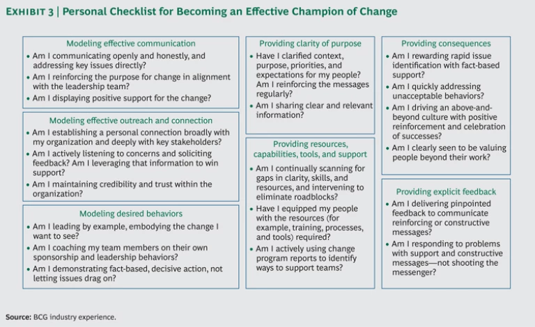 Throughout, leaders must continually, visibly, and authentically act as role models for the change. Furthermore, they must not tolerate the tendency to slip into old habits. The moment that senior managers are perceived as merely paying lip service to the change efforts, those efforts are doomed. An effective change champion models sponsorship of the effort, enables employees to achieve the declared goals, and drives accountability for the outcomes. (See Exhibit 3.)