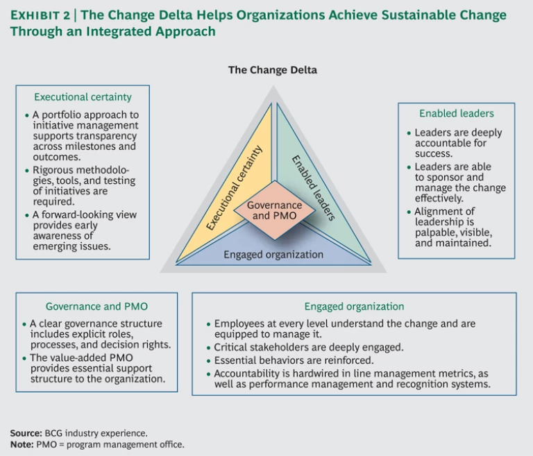 Working on change initiatives across several decades and in an array of industries, BCG has identified the distinct elements that come together to form what BCG calls the Change Delta—a set of success factors proven to help organizations achieve sustainable change through an integrated approach.