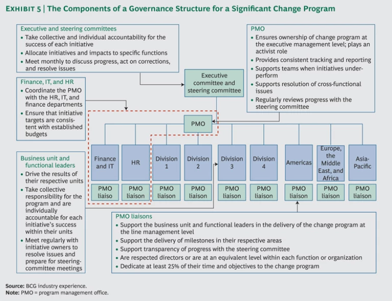 Governance and PMO If the three preceding elements are the arms and legs of a real change effort, then the governance, program management disciplines, and the role of the PMO are its nervous system. The fundamental idea: to have a way to keep top executives engaged and updated on critical milestones, planned operational or financial impacts, and emerging risks, and to provide them with the right information at the right time to take action.
