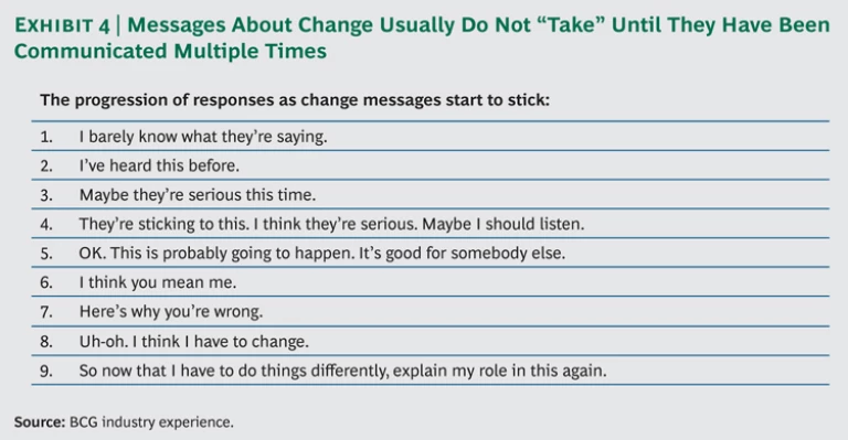 Of course, engagement is very much about great communication—clear, candid, constant, consistent, and two-way. “Generally people are not afraid of the unknown. They are afraid of the unexplained. A true leader shines a light on the road ahead to help others see where they are going,” one midlevel supervisor at a U.S. bank said when asked about his greatest frustration in implementing change. Such communication efforts start with active, effective listening to recognize and enlist the most critical stakeholders. These efforts involve rehearsal—lots of it—of the key messages. The process cannot be rushed and must be repeated, because there is inevitable “signal fade” as the message is transmitted throughout the organization. BCG has found it can take up to nine conversations to ensure that key change messages really do stick. (See Exhibit 4.) When senior leaders feel that they are communicating about three times as much as they ever thought they would need to, they are probably hitting it right. Moreover, it is really important to communicate in small, interactive group settings.