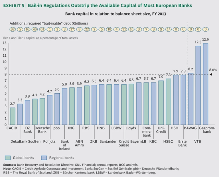 The BRRD, which was adopted by the EU parliament on April 15, 2014, established rules for the resolution of failing financial institutions. Under the rules, a resolution fund will be established and banks will be required to bail in 8 percent of liabilities before they can access the fund. Within the liability structure, customer deposits rank above senior unsecured debt—thus setting depositor preference—when the 8 percent threshold is determined. That requirement may lead to an increase in the cost of senior unsecured funding, especially for those banks whose capital position won’t permit them to cover the bail-in. (See Exhibit 5.)