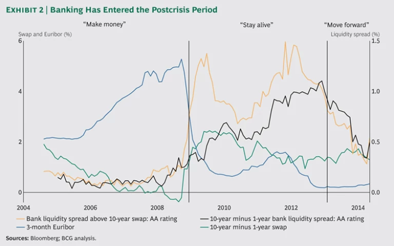 Liquidity spreads have also stabilized. Absolute levels and volatility have decreased. But historically low interest-rate levels combined with the current relatively flat curve, driven largely by central-bank policy, make it challenging for banks to earn returns from maturity transformation. (See Exhibit 2.)