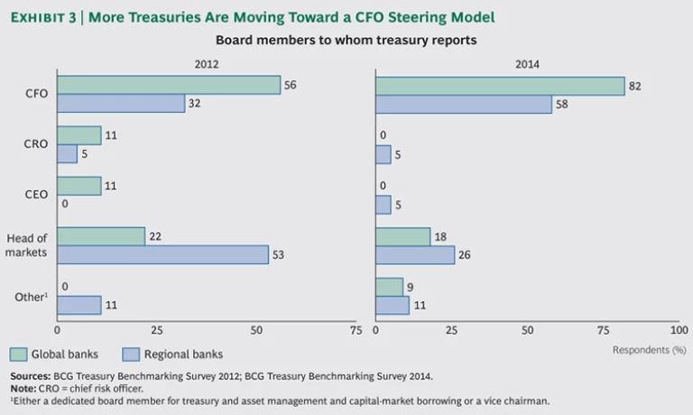 Treasury Operating-Model Orientation. Survey data shows that more banks are adopting a CFO-oriented model. Under that model, treasury reports to the CFO and is largely focused on steering tasks, with little or no direct client or trading responsibility and usually no market access. Between 2012 and 2014, the share of global bank treasurers reporting to the CFO increased from 56 percent to 82 percent, and the share of regional bank treasurers reporting to the CFO increased from 32 percent to 58 percent. These changes suggest that banks are prioritizing treasury’s banking-book-management focus, although some are extending that oversight function across the trading books. (See Exhibit 3.)