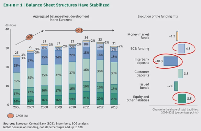 Balance sheet structures have stabilized. Central-bank funding declined from a high of 10 percent in 2012 to 7 percent in 2013. Interbank deposits saw a slight increase, rising from 16 percent in 2012 to 18 percent in 2013, as banks regained trust in the underlying health and solvency of the system.