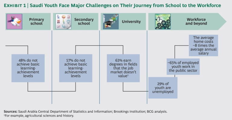 The challenges facing Saudi youth are reflected in data that traces their path from primary school through university and into the job market. (See Exhibit 1.) Forty-eight percent of primary-school students and 57 percent of secondary-school students do not meet basic learning-achievement levels. Sixty-three percent of university students receive degrees in subjects—such as agricultural sciences, education services, and humanities and the arts—that do not provide skills valued by private-sector employers. The absence of valued work skills among young Saudis is reflected in the fact that only 35 percent of those aged 16 to 29 have private-sector jobs. The unemployment rate for this age group is an astounding 29 percent. Furthermore, even those who have jobs struggle to find affordable housing. The average cost of a home is 8 times the average annual salary among all Saudis, compared with, for example, 3.4 times the average salary in the U.S.