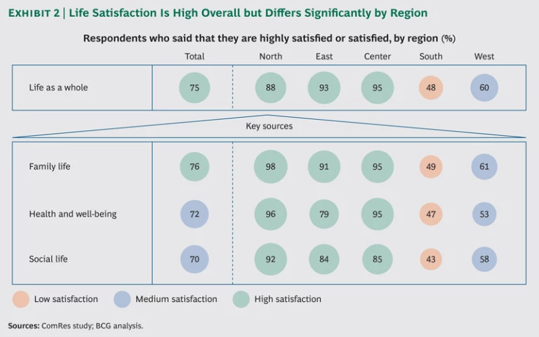 Seventy-five percent of the sample reported satisfaction with life. In terms of specific aspects of life, respondents said that they are most satisfied with family life (76 percent are satisfied or highly satisfied), followed by health and well-being (72 percent), and social life (70 percent). (See Exhibit 2.)
