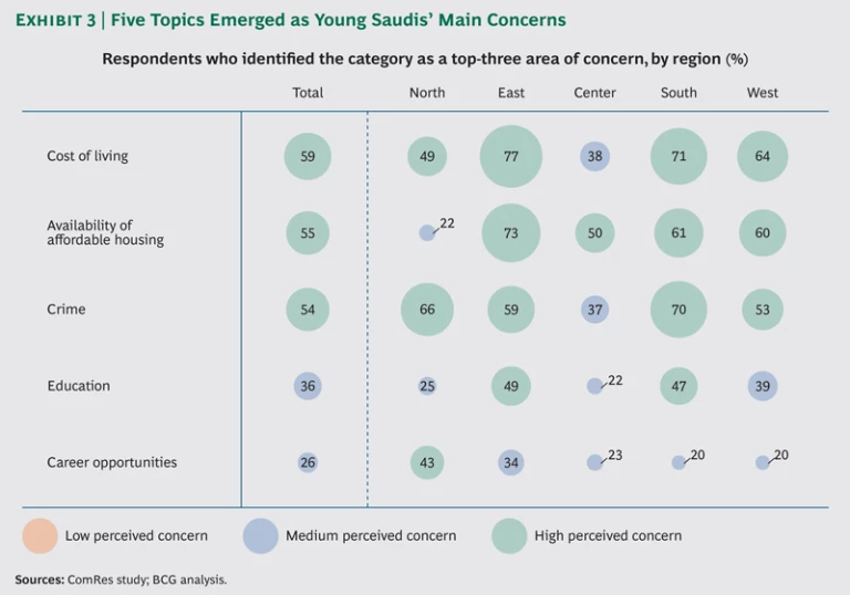 The High Cost of Living. Overall, nearly 60 percent of young Saudis ranked the high cost of living as one of their top three concerns. Regional disparities are quite apparent: respondents from the east and the south were more likely to cite this as a top concern than were those from the center.