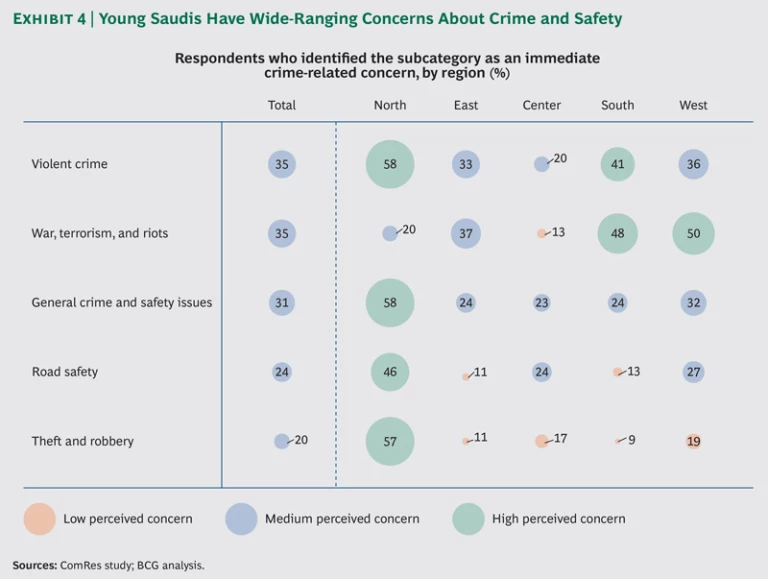Fear of Crime and Violence. Along with economic issues, many young Saudis are concerned about crime and violence. Nationwide, 54 percent of respondents included crime-related issues among their top three concerns. However, crime appears to be of greater concern in the north and south, where 66 percent and 70 percent, respectively, cited it among their top concerns. In contrast, only 37 percent from the center did so.