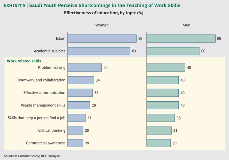 We asked young Saudis about their perception of the effectiveness of the education system. (See Exhibit 5.) Young Saudis consider it effective for teaching them about Islam and basic academic subjects (mathematics, reading, and writing). However, they reported much lower levels of satisfaction with instruction in the “soft” skills—for example, problem solving, teamwork and collaboration, effective communication, and critical thinking—that private-sector employers value. Saudi youth think that despite the great importance of these skills, the education system has not prepared them well, and they lack the skills to succeed in the job market or the workplace.