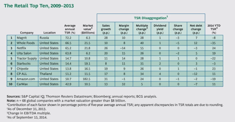 In 2014, as in past years, The Boston Consulting Group conducted an annual study of total shareholder return among 1,620 publicly traded companies in 26 industry sectors, of which 68 were in the retail