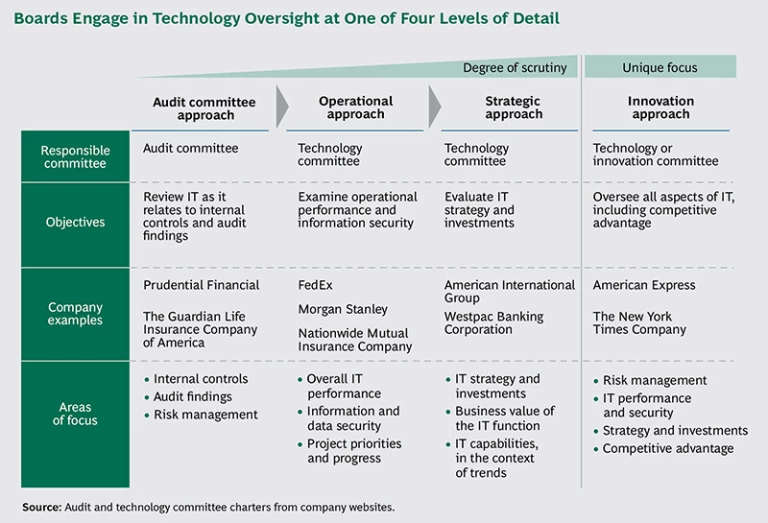 Consider the various approaches boards are currently taking toward IT oversight. Most still focus on internal controls and risk, and the audit committee steers the effort. But some boards have moved to an operational approach, creating technology committees that examine overall IT operational performance and information security, as well as project priorities and progress. Less frequently, boards are adopting a strategic approach, establishing a technology committee to evaluate the company’s IT strategy and investments, as well as the business value of the IT function. Finally, the boards of a global financial-services company and a large media organization have gone further still, tasking their technology or “innovation” committee, as it is sometimes called, with reviewing IT as it relates to competitive advantage, in addition to overseeing risk, operations, and strategy. (See the exhibit below.)