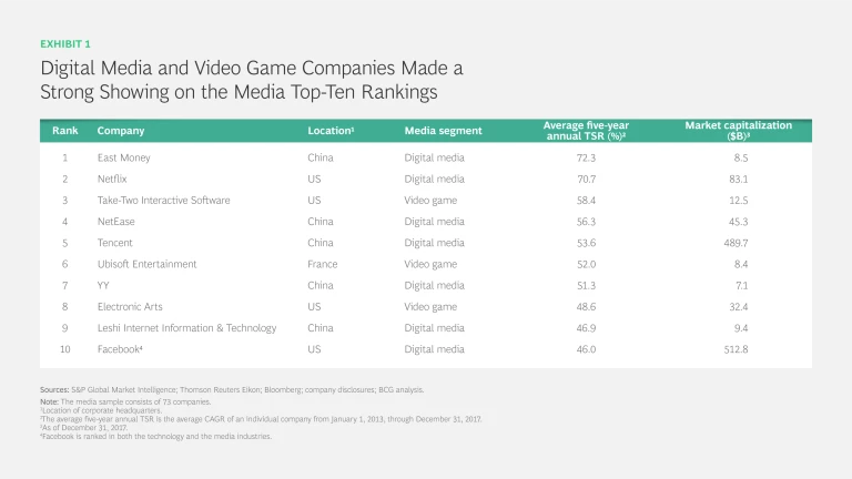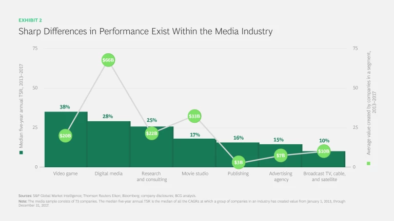 Its median five-year annual TSR of 28% surpasses that of a host of more traditional segments, including movie studio (17%), publishing (16%), advertising agency (15%), and broadcast TV, cable, and satellite (10%). (See Exhibit 2.)