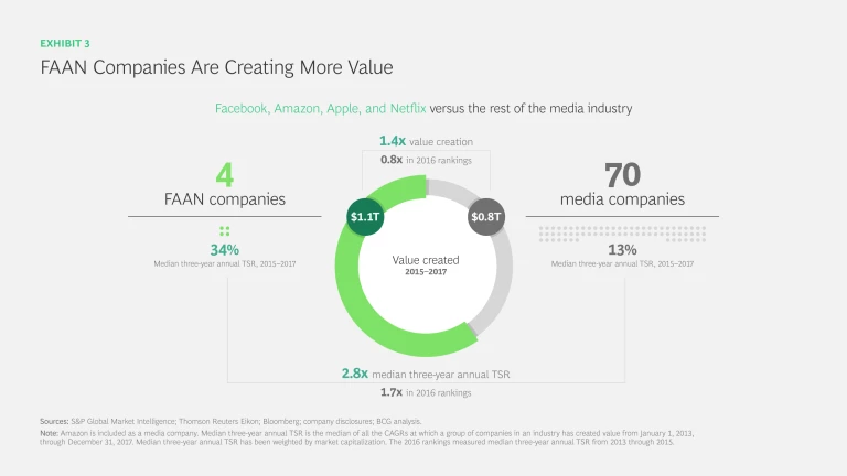 An analysis of absolute value creation reveals even more starkly the ascendency of digital natives. Indeed, the numbers underscore the continued and growing dominance of Facebook, Alphabet, Amazon, and Netflix (FAAN). This quartet generated $1.1 trillion in value in the three-year period from 2015 through 2017—or 140% as much as all other analyzed media companies combined. In our previous report, which looked at the three-year period from 2013 through 2015, the FAAN companies generated a “mere” 80% of the value created by the rest of the media companies. (A three-year period was used since Facebook’s initial public offering was May 2012.) (See Exhibit 3.)