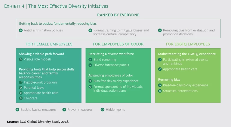 • To improve, companies need to invest in back-to-basics measures that all respondents agree are effective. These include setting antidiscrimination policies, providing formal training to mitigate biases and increase cultural competency, and removing bias from evaluation and promotion decisions.