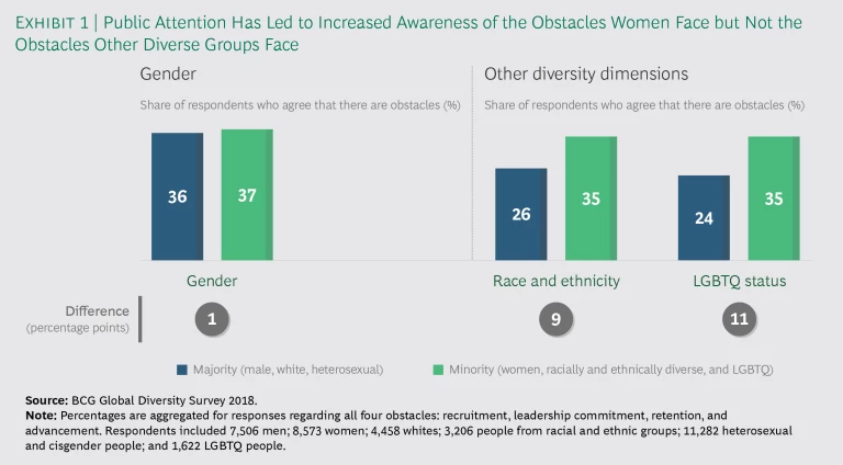 In terms of gender diversity, leaders are starting to get it. The disparity between the perceptions of leaders and those of women across all levels of the organization is relatively small. Men are more likely to see the obstacles that hold women back at work, probably because lately, the media has been covering such issues more openly. Yet the difference in the perceptions of straight, white men and those of people of color and LGBTQ employees remains significant. For example, just 26% of straight, white men see obstacles to the advancement of racially or ethnically diverse employees, compared with 35% of employees in that group. And straight white male leaders and LGBTQ employees indicate a similar difference in perception. (See Exhibit 1.)
