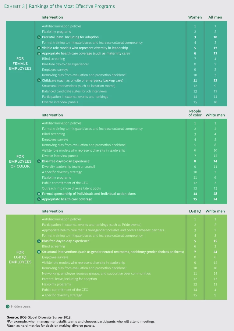In addition to identifying the three back-to-basics measures, our research highlighted proven interventions for each of the three groups we analyzed. All of these solutions were consensus picks by members of the specific group—women, people of color, or LGBTQ employees—and majority respondents outside of those groups.