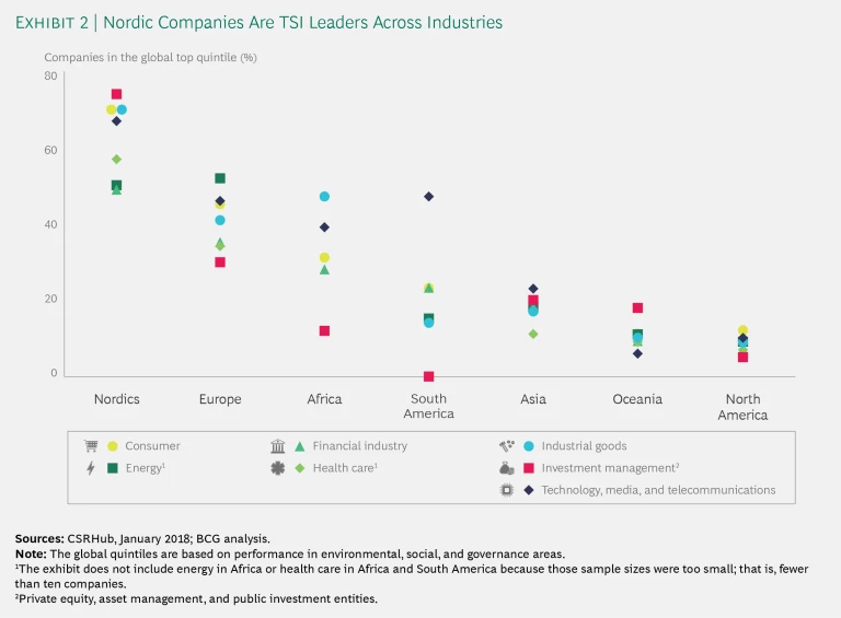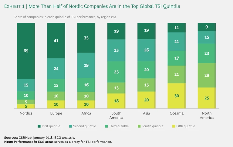 To explore regional variations of TSI, we used data from CSRHub, an aggregator of ESG data, to analyze the performance of more than 8,000 public and private companies worldwide—including more than 400 Nordic companies—to define global quintiles for overall ESG performance. We then analyzed the results by region, country, and industry to understand how ESG performance differed across those categories.