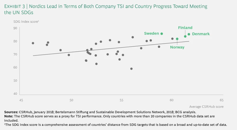 It is not surprising that the strong Nordic corporate performance on TSI is reflected in Nordic countries’ progress in achieving the UN SDGs. (See Exhibit 3.) Furthermore, the Nordics are leaders in creating well-being for their own populations. Nordic companies are top performers in Striking a Balance Between Well-Being and Growth, a diagnostic that tracks the relative well-being of countries around the world. (See Striking a Balance Between Well-Being and Growth: The 2018 Sustainable Economic Development Assessment, BCG report, July 2018.) In fact, Finland, Denmark, Norway, and Sweden have been in the top ten since the ranking was launched in 2012, Norway claiming the top spot every year.