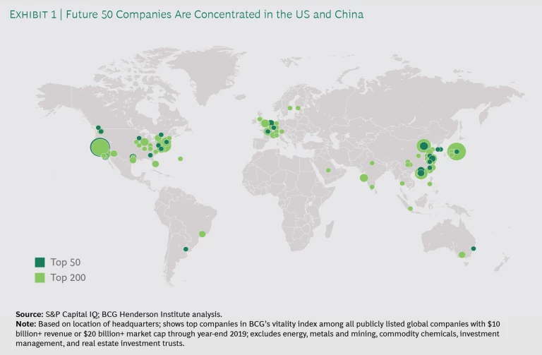 Patterns among the Future 50 provide a fascinating window into important trends in the business landscape. As in prior years, a regional breakdown of the index points toward a bipolar future. More than 80% of the world’s 50 most vital companies are located in North America or Greater China. While this may seem surprisingly skewed, the distribution echoes recent global growth trends: more than 70% of the fastest-growing companies over the past three years also come from these two regions. (See Exhibit 1.)