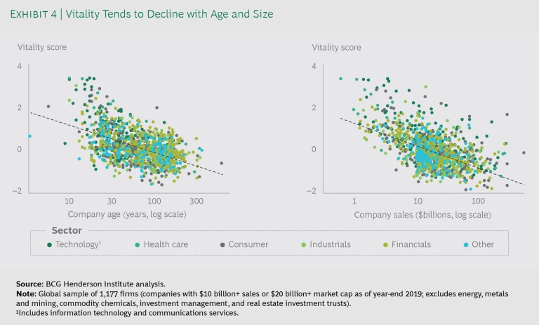 Companies tend to struggle to maintain vitality as they mature. Scale breeds complexity, organizational models become entrenched, and the strategic focus of management teams shifts toward narrowly defined, short-term goals. As a result, we see the capacity for innovation and reinvention decline markedly with age and size. (See Exhibit 4.)