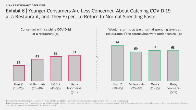 Consumer sentiment data indicates that restaurants oriented toward younger audiences are likely to recover more speedily, given that Gen-Zers are the cohort least concerned about catching the virus at a restaurant, and given that a substantial majority (74%) of them believe that they will revert to their normal spending levels at restaurants once the virus is under control. (See Exhibit 6.)