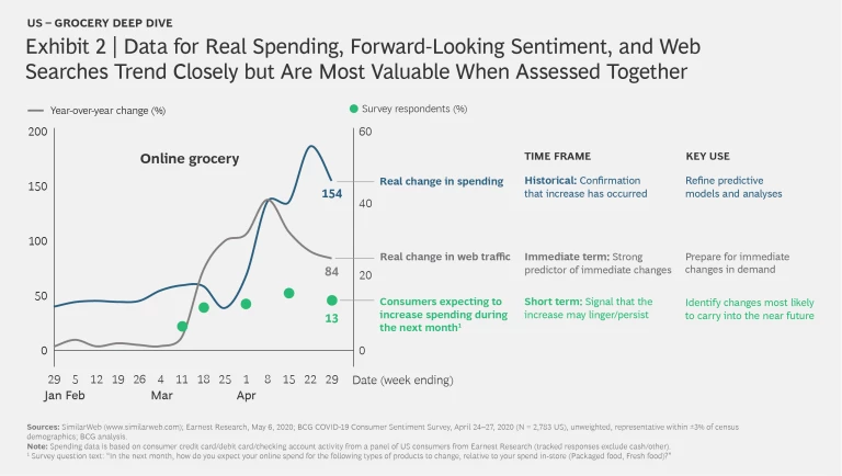 In our work with grocery retailers and consumer goods manufacturers, we have found that monitoring changes in credit card spending, stated intention to spend, and changes in web traffic and online search trends, when done in combination, can shed light on the leading indicators of demand. (See Exhibit 2.) Changes in web traffic and searches presage spending trends by a week or so, and sentiment signals can help researchers understand the extent to which these changes are likely extend beyond that period.