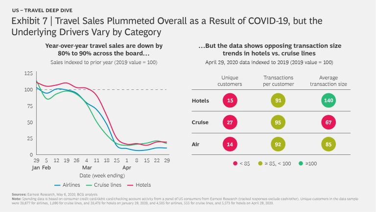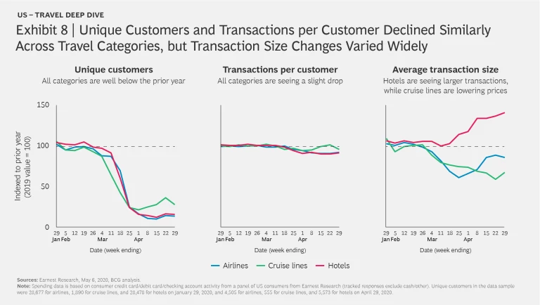 The path toward recovery will probably also look a bit different for each of these sectors. For example, the trend line for hotels suggests that they may be able to rely more on transaction size, at least initially, while cruises may be starting to see a recovery in unique customers. (See Exhibit 8.) It is important to note, however, that most companies in the sector currently permit fully refundable credit card bookings, meaning that consumers may be booking today across the airline, hotel, and cruise subsectors in the hope that they will feel comfortable traveling at the planned trip date; but what the follow-through on bookings will look like as we head out of lockdown remains to be seen. Undoubtedly the state of the coronavirus itself will strongly influence consumers’ ultimate decisions about leisure travel.