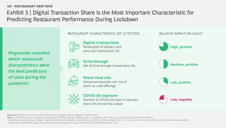 Many companies were already advancing their digital agendas, and the quick shift to lockdown during the recent crisis has highlighted the importance of moving quickly—particularly in the restaurant industry. We conducted a regression across 35 large restaurant chains and 23 factors to understand what was driving differences in recent performance across brands: Digital transaction penetration was the single most important predictor of stronger performance during the crisis—and was nearly twice as important as the COVID-19 exposure variable. (See Exhibit 5.) Companies that accelerated their digital and off-premises agenda before the crisis are being rewarded. It is increasingly important for restaurants to accelerate their digital demand generation and encourage customers to develop sticky habits during the crisis that will benefit them in the subsequent recovery.