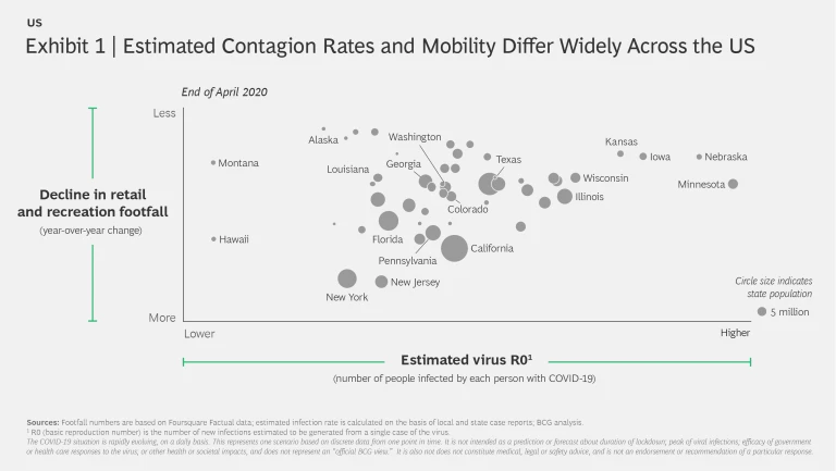 At the same time, businesses need to consider underlying trends and build a de-averaged understanding of the data. On-the-ground trends differ widely across geographies. (See Exhibit 1.) Some states (such as New York and New Jersey) have seen recent levels of footfall traffic drop by close to two-thirds, while mobility in others (such as Alaska, Kansas, and Iowa) is close to what it was last year. Another important variable is the virus contagion rate—a measure of how many other people each COVID-19-infected person is likely to infect. In some states, this rate is twice as high as it is in others. Monitoring these types of real-time trends can enable companies to consider an appropriate range of scenarios regarding how consumer activity could evolve in specific geographies.