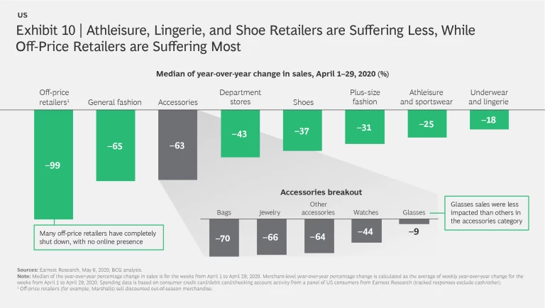 The crisis has also heavily hit apparel and department stores. The precise impact varies significantly by category, however, with sales of essential accessories such as glasses down less than 10% in April, thanks to healthy online sales, while sales of luxury items such as handbags and jewelry are down by two-thirds or more. (See Exhibit 10.) Despite the severe overall declines, the new shape of consumption offers opportunities for brands in categories such as athleisure to find and serve pockets of demand among consumers who are spending significantly more time at home.