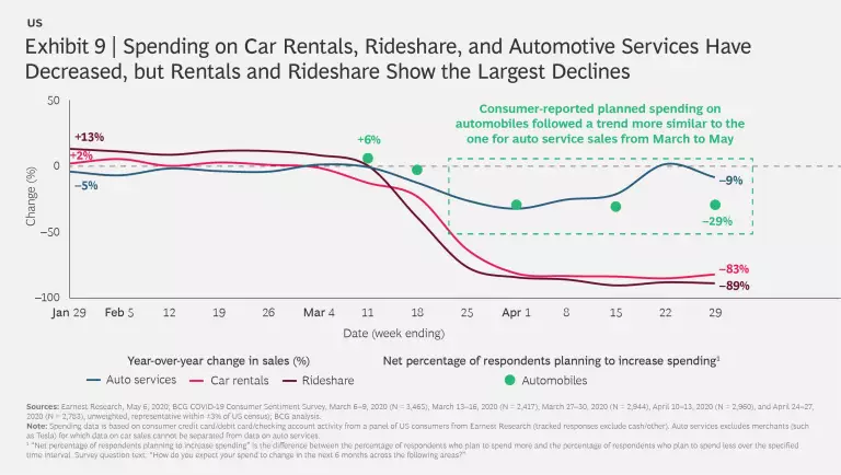 The automotive sector, too, has experienced an overall decline in sales, but the size of that decline differs significantly from one subsector to another. (See Exhibit 9.) For example, we see car rentals and rideshare suffering year-over-year declines of more than 80%, likely because of consumers’ concern about catching the virus from these sources; in our April 24–27 survey, 32% of consumers reported having such concerns about rideshare.