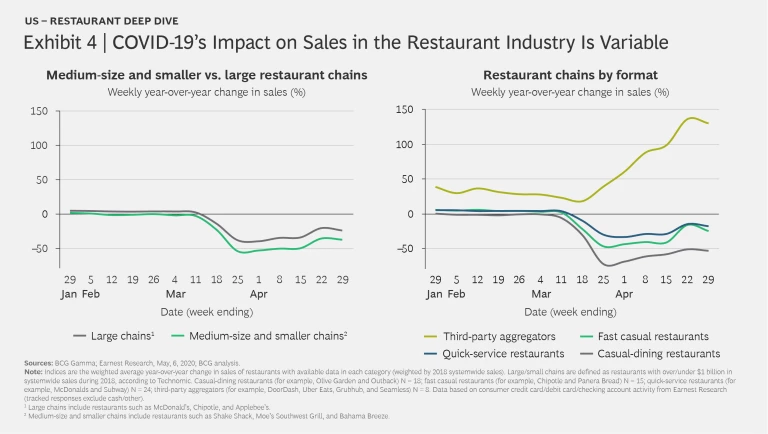 Following an initial period of sharply declining sales across the US restaurant industry, as a result of lockdowns, declines now appear to be leveling off. Nevertheless, we see significant variation in performance across the industry: quick-service (that is, fast-food) restaurants are performing better than average, and casual-dining restaurants are performing worse than average—no surprise, given that dine-in has been shut down. (See Exhibit 4.) In terms of specific cuisines, pizza chains are enjoying growth of 13%, while sales at cafés and family-style restaurants are down 55% to 75%. Third-party delivery aggregators, such as DoorDash, Uber Eats, GrubHub, and Seamless, have substantially exceeded their baseline growth, as many restaurants now rely on them to reach customers at home. Going forward, restaurants must secure their top line with rapid changes in their menu offering and must innovate new channel and service options to meet changing customer needs.