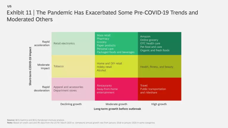 It is instructive to map long-term category trends against short-term COVID-19 impacts. (See Exhibit 11.) The current crisis has accelerated trends that were already underway, such as the rise of Amazon and of organic foods and the decline of department stores. Before the crisis, the biggest barrier to increased penetration in online grocery shopping was consumer diffidence about giving it a try: consumers who shopped for groceries online once were highly likely to do so again. Because the pandemic has forced a large portion of the population to take the plunge in ordering groceries online for the first time, it has enabled the segment to skip years ahead in the pending channel mix shift.