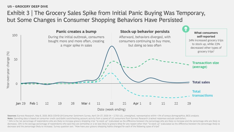 As the example of consumer behavior in the retail grocery segment shows, looking at overall sales trends is not sufficient. After a massive spike, overall grocery sales in many markets have reverted to levels seen earlier in the year. (See Exhibit 3.) Underlying that trend, however, is the fact that consumers have significantly cut back on the number of trips they make, likely to avoid frequent interactions with others due to COVID-19, but have increased the total transaction size for each trip. For grocers, this change in consumer behavior has profound implications for assortment decisions, and it raises new challenges for the marketers of impulse add-on items.