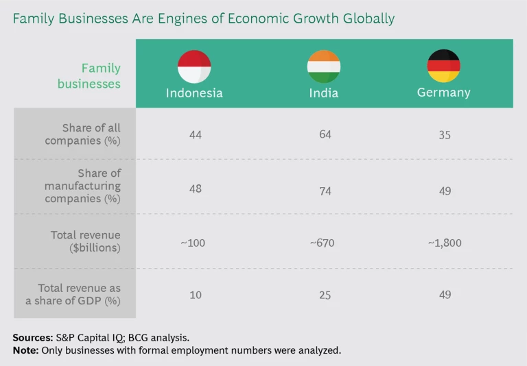 The role that family businesses play in advancing economic growth is hard to overstate. (See “An Economic Bedrock Through the Ages.”) In many major economies, family-owned businesses account for a significant share of all companies. Our analysis of Indonesia, India, and Germany found that family businesses represent 48% to 74% of all manufacturing companies. (See the exhibit.) They also create millions of jobs through direct employment and millions more indirectly. And they inject significant revenue flows into these economies. In Indonesia, family-run businesses generate more than $100 billion (roughly 10% of GDP). In India, that figure climbs to nearly $670 billion (about 25% of GDP). And in Germany, family businesses contribute a massive $1.8 trillion in revenue (approximately 49% of the country’s GDP).